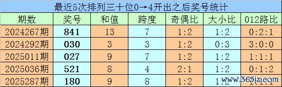 1、最近两期罗列三十位号码开出号码离别为0和4,历史上十位号码聚合两期同期出现号码0和4的奖号共开出81期。最近五次下期开出号码为:841、030、027、521、180;