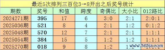 1、罗列三最近两期百位号码离别开出3和8,历史上百位号码聚合两期离别开出3和8的奖号出现了97期。前五期开出之后其下期奖号离别为:395、521、570、384、018;